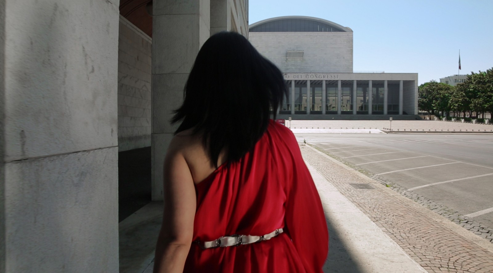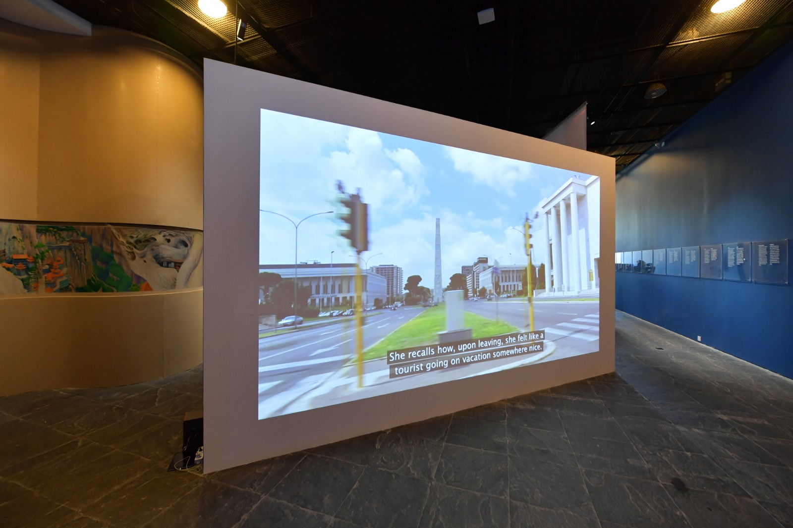 梅·海瑟格(Maj Hasager)《我們將在盲點相遇》是展覽呈現(xiàn)的最后一件作品,其講述了關(guān)于羅馬新城EUR區(qū)(Esposizione Universale di Roma)里的菲律賓移民的故事。這座由墨索里尼親自監(jiān)督設(shè)計的,以法西斯美學(xué)構(gòu)想出來的烏托邦城市,直至1960年才建成并被逐步被開發(fā)為羅馬新的富人區(qū)。海瑟格把眾多意大利導(dǎo)演在EUR區(qū)攝制的紀(jì)錄片、電影所刻畫的城市公共記憶,與這群定期在市中心一座教堂的地下室聚會的移民社群一同放入她的影像作品中,影像記錄了這個群體的閑暇時光,以一種個人的、私密的視角探索了菲律賓移民的私人記憶與生活如何融入并生存于這座有著強大歷史記憶的城市之中。正如約翰·伯格(John Berger)在《第七人》中的論述:“兩群不同的人在任何情況下,永遠(yuǎn)都是共性大于差異性的。只是由于種種原因,環(huán)境蒙蔽了人們的眼睛?!盵7]我們看得見的是歷史的記憶碾壓而過留下的軋痕以及其帶來的城市變遷,而看不見的是居于其中的人是如何在此種變遷中安放自我的記憶與故事。從這個立意來看,展覽所討論的議題似乎又回溯到了“公共”與“私人”,“歷史”與“記憶”之間的連接,然而涉及的場域已經(jīng)擴(kuò)展到了一個城市或是一種文化以外。