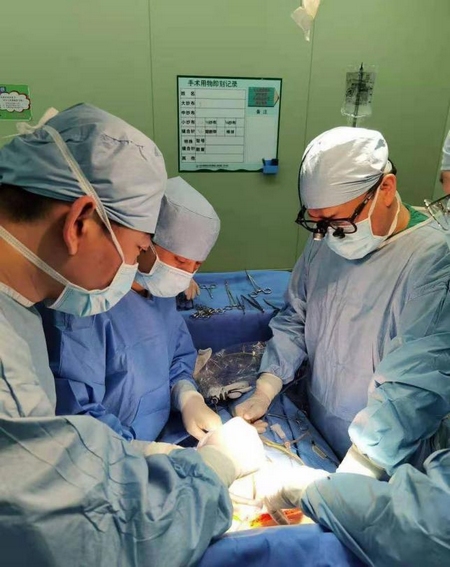 普外科主任崔云甫教授(右)和膽胰外科蘇志雷副教授(左2)應用經(jīng)肝臟動脈灌注驅(qū)血技術(shù)完成