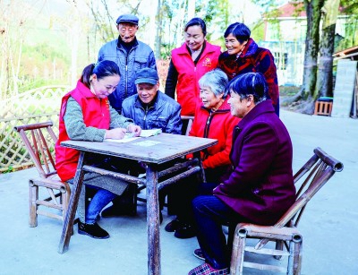 浙江長(zhǎng)興縣和平鎮(zhèn)方家莊村便民服務(wù)中心志愿者為村里老人上門(mén)辦理第三代社??〒Q證業(yè)務(wù)。新華社發(fā)