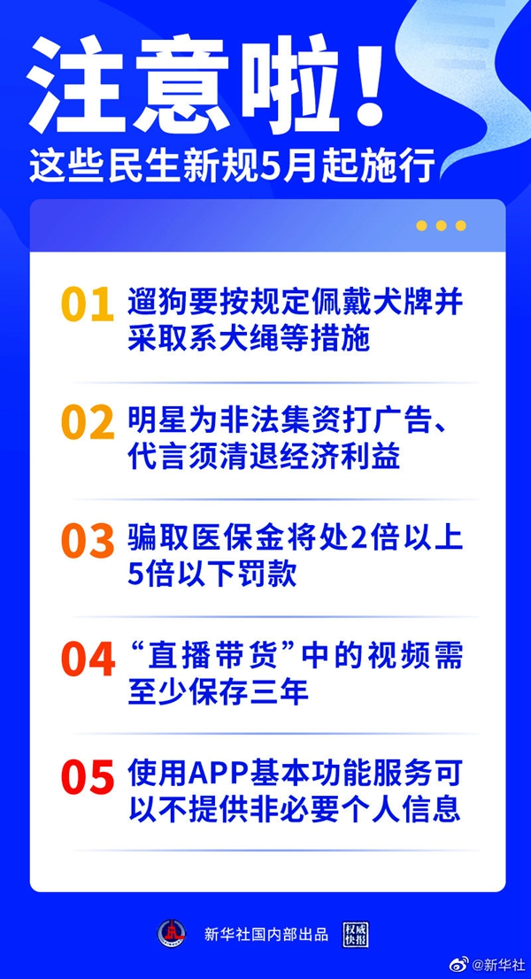 五一假期將如約而至,一批新規(guī)也將于5月1日開始施行。遛狗要系繩、騙醫(yī)保金要罰款、名人為非法集資打廣告要退回酬勞……法治陽光更普照,社會生活更美好。來看看,哪一條切中了你的關(guān)心事?(新華社記者白陽 海報設(shè)計楊軼群)