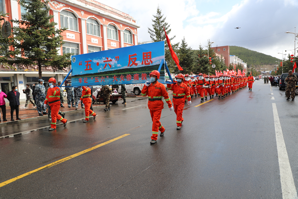 9時(shí),反思活動(dòng)正式開(kāi)始。林業(yè)局處級(jí)領(lǐng)導(dǎo)與職工群眾鄭重地在在“牢記歷史 汲取教訓(xùn) 振奮精神 開(kāi)拓進(jìn)取 建設(shè)美麗藍(lán)莓小鎮(zhèn)”宣傳條幅上,鄭重地簽上了自己的名字。并舉行了聲勢(shì)浩大的人員游行、車輛游行。由運(yùn)兵車、運(yùn)兵車、人工增雨車等26臺(tái)特種車輛,拉響警報(bào),緊跟在由森林消防大隊(duì)組成的100余人步行方陣后,他們身穿防火戰(zhàn)斗服,手舉寫有“‘五?六’反思”巨型防火宣傳牌和防火宣傳彩旗,尤其是手執(zhí)高速渦流噴射滅火機(jī)、脈沖槍、斯蒂爾風(fēng)力滅火機(jī)的隊(duì)員,邁著整齊的步伐,喊著響亮的口號(hào),立即吸引了過(guò)往的居民的注意,成為最亮眼的“明星”。