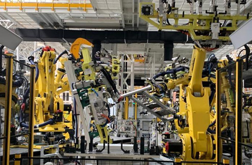 資料圖:江西上饒一家新能源電動(dòng)汽車公司的智慧工廠內(nèi),機(jī)器人正同時(shí)作業(yè)?!±铐嵑?攝