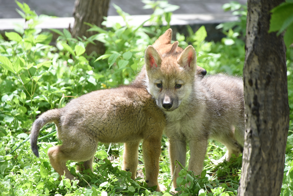 比起 “獨(dú)生子”的小羚羊,在狼散放區(qū)出生的小家伙們可真稱(chēng)得上是大家庭了。同樣是四月份出生的狼崽們多達(dá)13只,新生娃數(shù)量目前在園里遙遙領(lǐng)先,他們分別來(lái)自于四個(gè)不同家庭,最多的一窩小狼崽有兄弟姐妹6個(gè),最少的也是雙胞胎。這13只小狼崽斷奶后過(guò)起了集體生活,每天一起吃飯,一起睡覺(jué),一起學(xué)習(xí),一起玩耍,簡(jiǎn)直不要太熱鬧。尤其是白天在室外運(yùn)動(dòng)場(chǎng)活動(dòng)時(shí),小狼崽們時(shí)而分成幾個(gè)小組活動(dòng),時(shí)而湊在一起,像一堆毛球擠成一團(tuán)。在這其中有一只小狼不到滿月就顯示出了狼王的天性,小尾巴翹的高高的,一幅天不怕地不怕的樣子誰(shuí)都敢挑戰(zhàn),勇敢值爆表。飼養(yǎng)員說(shuō)它具有狼王潛質(zhì),幾年后有可能成為新的狼王。