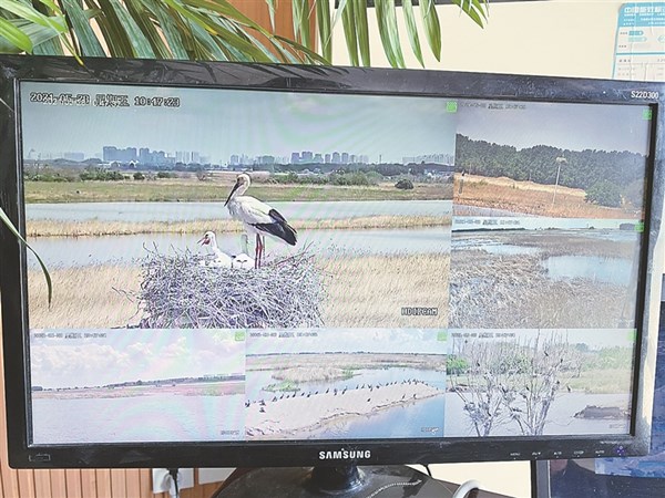 這幾天,黑龍江睿濤環(huán)保科技有限公司辦公室主任王東升總是去鳥類監(jiān)測平臺(tái)看來到百鳥湖景區(qū)“安家”的東方白鸛一家。起初,是一對東方白鸛來到這里筑巢。5月中旬,王東升在監(jiān)測平臺(tái)的顯示器里驚喜地發(fā)現(xiàn),這對東方白鸛孵化出了5只寶寶。