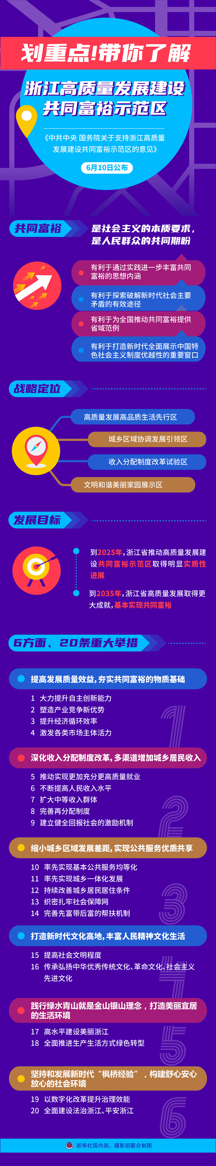《中共中央 國務(wù)院關(guān)于支持浙江高質(zhì)量發(fā)展建設(shè)共同富裕示范區(qū)的意見》10日發(fā)布。共同富裕示范區(qū)有哪些亮點(diǎn)?提出了哪些重大任務(wù)?如何讓共同富??吹靡?/span>、摸得著、真實(shí)可感?打開這張圖,帶你了解浙江高質(zhì)量發(fā)展建設(shè)共同富裕示范區(qū)。(新華社記者謝?,?安蓓 制圖 陳為)
