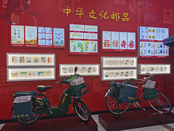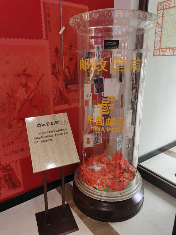 一進門右手邊,是一個透明的郵政信筒,它來自2008年北京殘奧會閉幕式,現(xiàn)場有很多人通過它投遞出了《寄給未來的信》。左右兩側的墻上,懸掛著中華文化郵品,用郵票的形式展示傳統(tǒng)文化,重陽節(jié)、梅蘭芳舞臺藝術、景德鎮(zhèn)瓷器等具有紀念意義的郵票都位列其中,這里是集郵愛好者的天堂。