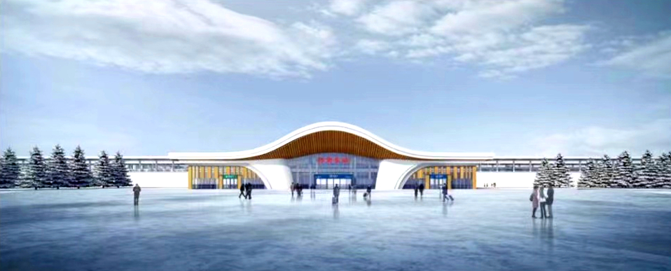 林口南站建筑面積2998.19平方米,可容納800旅客候車。設(shè)2條正線,2條到發(fā)線,站房外觀設(shè)計(jì)如同“林中木屋”,融入林口縣特有的“山水神秀”文化底蘊(yùn),給人以厚重堅(jiān)實(shí)之感,并將英雄之城的紅色文化融入其中,象征城市精神如山巒屹立。兩側(cè)較小體塊烘托中部門式造型,窗格構(gòu)件相互交織,如森林霧凇,體現(xiàn)寒冷地區(qū)建筑特質(zhì),具有雪原建筑意向。車站穩(wěn)重大氣、簡潔壯麗,通過現(xiàn)代建筑語言詮釋了站房的人文之靈,彰顯現(xiàn)代交通建筑特征。