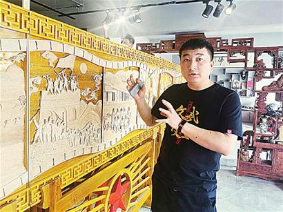 近年來,李寶峰大膽嘗試,在傳統(tǒng)木雕作品的基礎(chǔ)上不斷創(chuàng)新,懷著對黨的感恩和對家鄉(xiāng)的熱愛,不斷將作品注入紅色元素,積極探索設(shè)計創(chuàng)作具有時代氣息的木雕作品,用刀木刻畫春秋、記錄時代變遷。