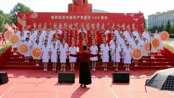 新林林業(yè)局機關(guān)黨委為現(xiàn)場觀眾展演《沒有共產(chǎn)黨就沒有新中國》《歌唱祖國》。大合唱現(xiàn)場舉行了黨旗傳遞活動,巨幅黨旗經(jīng)過新林區(qū)局黨員干部職工緩緩傳遞。