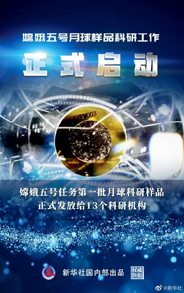 剛剛,國家航天局探月與航天工程中心在京舉行嫦娥五號任務(wù)第一批月球科研樣品發(fā)放儀式,標(biāo)志著月球樣品科學(xué)研究工作正式啟動。經(jīng)審核,來自13所科研機(jī)構(gòu)的31份申請獲得通過。(新華社記者 胡喆 海報設(shè)計 苗夏陽)