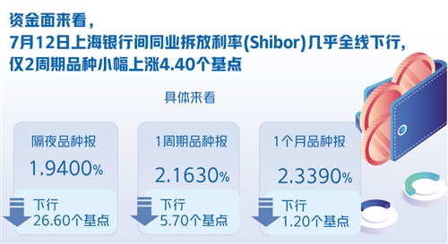 資金面來看,7月12日上海銀行間同業(yè)拆放利率(Shibor)幾乎全線下行,僅2周期品種小幅上漲4.40個(gè)基點(diǎn)。具體來看,隔夜品種報(bào)1.9400%,下行26.60個(gè)基點(diǎn);1周期品種報(bào)2.1630%,下行5.70個(gè)基點(diǎn);1個(gè)月品種報(bào)2.3390%,下行1.20個(gè)基點(diǎn)。