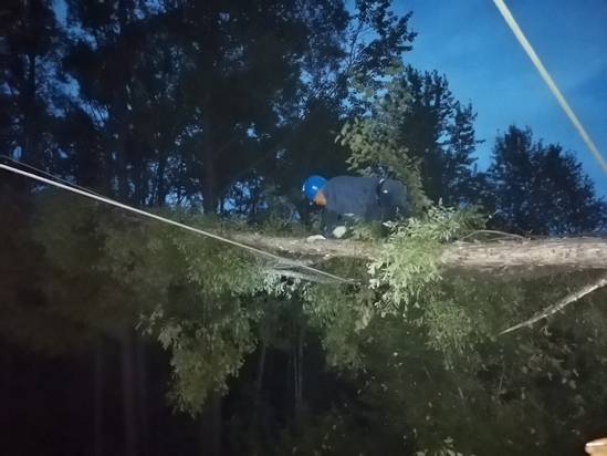 飛機巡查發(fā)現(xiàn)的呼碧線128號電線桿和129號電線桿之間線路故障處,由呼中輸電運檢班組負責搶修,需搶修人員步行穿過密林和水道,經(jīng)過1個多小時的艱難跋涉方能到達,現(xiàn)場電線上掛著一棵直徑40多厘米的風倒樹,導致電線破損,搶修人員將風倒樹用手鋸切割移除,并對破損電線進行補強,截至21時30分,呼碧線兩處故障全部搶修完畢,呼中區(qū)陸續(xù)完成供電。