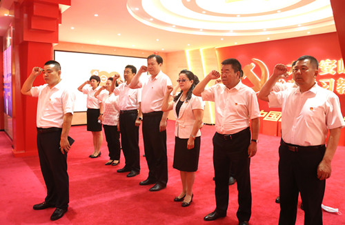 在地區(qū)黨史學(xué)習(xí)教育展館,面對(duì)鮮紅的黨旗,新林區(qū)委書記領(lǐng)誓,區(qū)委理論學(xué)習(xí)中心組成員集體宣誓,重溫入黨誓詞,砥礪前進(jìn)初心,勇?lián)氊?zé)使命。