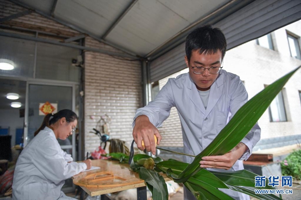 8月2日,在吉林省梨樹縣四棵樹鄉(xiāng)三棵樹村“科技小院”,中國農(nóng)業(yè)大學(xué)博士研究生沙野(右)和在讀碩士郭雯清測量、記錄玉米植株樣本。