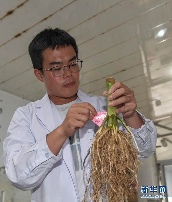8月2日,在吉林省梨樹縣四棵樹鄉(xiāng)三棵樹村“科技小院”,中國農(nóng)業(yè)大學(xué)博士研究生沙野觀察玉米根系樣本。