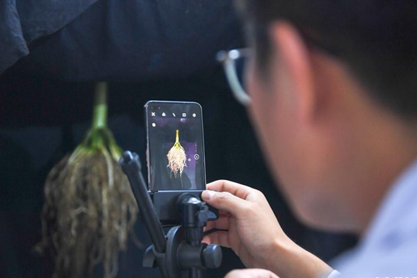 8月2日,在吉林省梨樹縣四棵樹鄉(xiāng)三棵樹村“科技小院”,中國農(nóng)業(yè)大學(xué)博士研究生沙野給玉米根系樣本拍照。