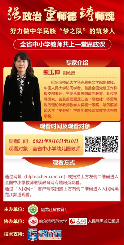 據(jù)了解,自9月6日至10日省教育廳將組織開展“全省中小學(xué)教師共上一堂思政課”活動(dòng),將邀請(qǐng)專家學(xué)者就提升思想政治素質(zhì)和師德水平、更好擔(dān)負(fù)起立德樹人根本任務(wù)為全省中小學(xué)教師授課。本次活動(dòng)將以線上課堂形式舉辦。參加人員通過全國中小學(xué)教師繼續(xù)教育網(wǎng)專題網(wǎng)頁收聽收看。