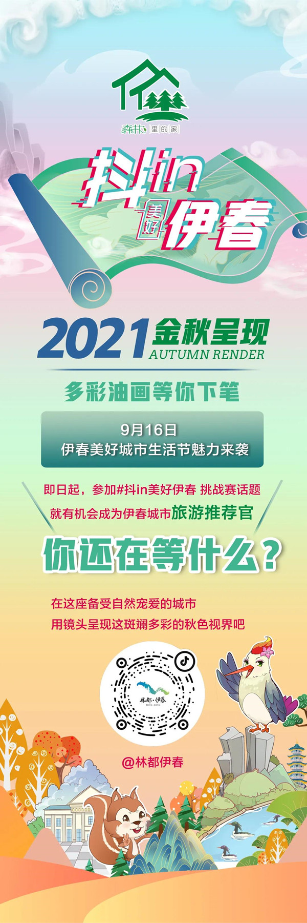 16日,伊春市文化廣電和旅游局、哈爾濱新媒網(wǎng)絡(luò)科技有限公司聯(lián)合策劃發(fā)起抖音挑戰(zhàn)賽 #抖in美好伊春正式上線,來伊春拍攝五花山色或分享身邊的秋季美景,視頻添加話題并關(guān)注賬號“林都伊春”即可參與成功。