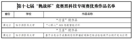 黑龍江經(jīng)濟(jì)網(wǎng)訊(黑龍江日?qǐng)?bào)全媒體見(jiàn)習(xí)記者董廣碩 商祺)近日,第十七屆“挑戰(zhàn)杯”全國(guó)大學(xué)生課外學(xué)術(shù)科技作品競(jìng)賽落下帷幕,哈爾濱醫(yī)科大學(xué)附屬二院團(tuán)隊(duì)《“心聯(lián)心”AED急救智能手環(huán)》和哈醫(yī)大附屬腫瘤醫(yī)院團(tuán)隊(duì)《基于全息分子成像系統(tǒng)的惡性腫瘤前哨淋巴結(jié)活檢檢測(cè)平臺(tái)的開發(fā)與應(yīng)用》兩個(gè)作品在“黑科技”專項(xiàng)賽終審決賽中,分別榮獲“行星級(jí)”和“衛(wèi)星級(jí)”稱號(hào)。