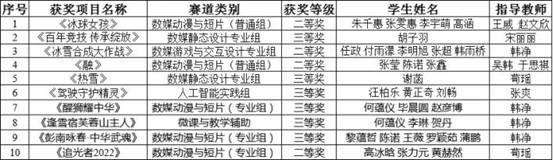在參賽學(xué)生與指導(dǎo)教師的共同努力下,10項作品進入國賽(包括大數(shù)據(jù)應(yīng)用組、人工智能實踐組、數(shù)媒動漫與短片組、數(shù)媒靜態(tài)設(shè)計專業(yè)組、微課與教學(xué)輔助組、數(shù)媒游戲與交互設(shè)計組),最終喜獲全國二等獎4項,全國三等獎6項。