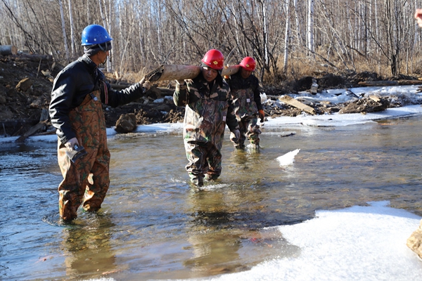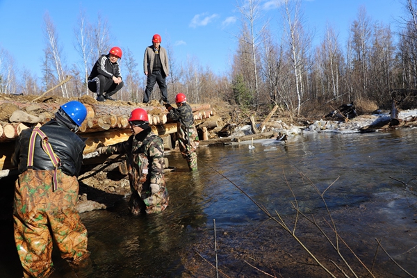 阿木爾林業(yè)局多種經(jīng)營(yíng)公司職工涉水檢查新建橋梁安全系數(shù)。