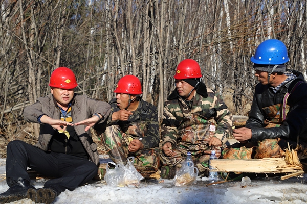 阿木爾林業(yè)局多種經(jīng)營(yíng)公司黨支部書記、經(jīng)理孫乃彬(左一)同職工一起邊吃飯邊研究下步修橋工作。