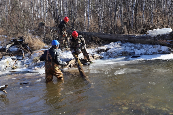 阿木爾林業(yè)局多種經(jīng)營(yíng)公司職工清理水毀橋河道里的雜木。