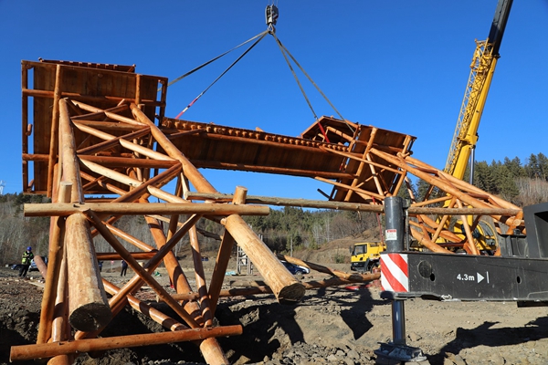 早上10點(diǎn)58分,只見平靜的林業(yè)局薩布素軍馬場(chǎng)頓時(shí)熱鬧了起來(lái),兩臺(tái)大型起重機(jī)發(fā)動(dòng)機(jī)嗡嗡作響,一東一西緩慢吊起10多噸重的大門,因偏向一側(cè)首次作業(yè)沒(méi)有成功。安裝技術(shù)人員調(diào)整重心點(diǎn),第二次試舉,并在一臺(tái)裝載機(jī)的協(xié)助下,調(diào)整機(jī)位,歷時(shí)2個(gè)多小時(shí),才將具有濃郁驛站文化風(fēng)格的高10米、寬14米的木質(zhì)大門,矗立在平地上。