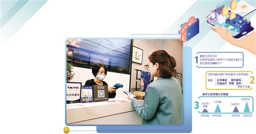 線下場(chǎng)景日益多元的同時(shí),數(shù)字人民幣交易場(chǎng)景也正在發(fā)力線上,形成了“線上+線下”并行推廣的格局。現(xiàn)在,數(shù)字人民幣已經(jīng)可以在京東、美團(tuán)、滴滴等多個(gè)線上場(chǎng)景使用。截至10月22日,已有155萬(wàn)商戶支持?jǐn)?shù)字人民幣錢包,涵蓋公共事業(yè)、餐飲服務(wù)、交通出行、購(gòu)物和政務(wù)等各個(gè)方面。