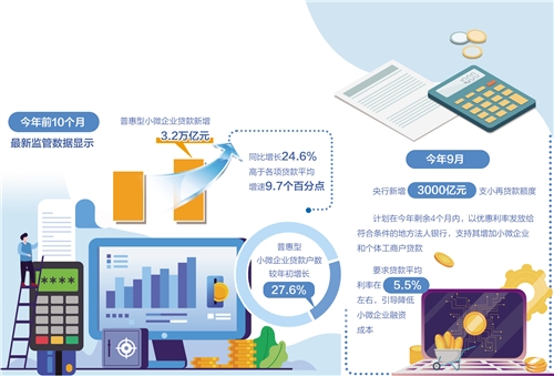 最新監(jiān)管數(shù)據(jù)顯示,今年前10個月,普惠型小微企業(yè)貸款新增3.2萬億元,同比增長24.6%,高于各項(xiàng)貸款平均增速9.7個百分點(diǎn);普惠型小微企業(yè)貸款戶數(shù)較年初增長27.6%。