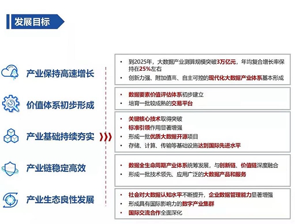 規(guī)劃明確,到2025年,大數(shù)據(jù)產(chǎn)業(yè)測算規(guī)模突破3萬億元。其中特別提出,數(shù)據(jù)要素價值評估體系初步建立;產(chǎn)業(yè)基礎持續(xù)夯實,關鍵核心技術取得突破;形成一批技術領先、應用廣泛的大數(shù)據(jù)產(chǎn)品和服務。