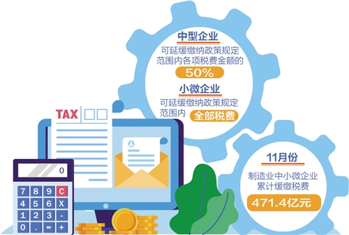 剛剛過(guò)去的11月是制造業(yè)中小微企業(yè)階段性稅收緩繳政策實(shí)施首月。12月1日,國(guó)家稅務(wù)總局發(fā)布統(tǒng)計(jì)數(shù)據(jù)顯示,這項(xiàng)政策實(shí)施效果顯著,制造業(yè)中小微企業(yè)已累計(jì)緩繳稅費(fèi)471.4億元。