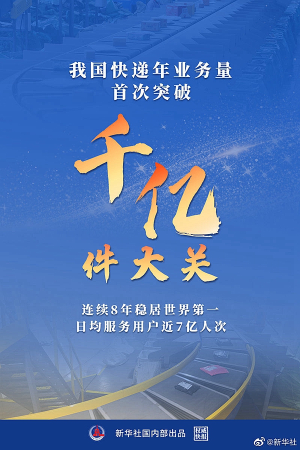 12月8日,國(guó)家郵政局快遞大數(shù)據(jù)平臺(tái)實(shí)時(shí)監(jiān)測(cè)數(shù)據(jù)顯示,2021年我國(guó)快遞業(yè)務(wù)量已達(dá)1000億件,這是我國(guó)快遞年業(yè)務(wù)量首次突破千億級(jí)別,已連續(xù)8年穩(wěn)居世界第一,日均服務(wù)用戶近7億人次。(新華社記者戴小河 海報(bào)設(shè)計(jì)楊軼群)