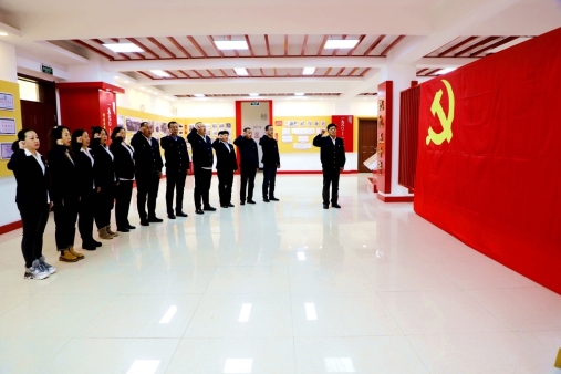 阿木爾林業(yè)局工會(huì)處級(jí)領(lǐng)導(dǎo)和林業(yè)局環(huán)衛(wèi)隊(duì)黨員干部職工面對(duì)黨旗重溫入黨誓詞(王力 攝)