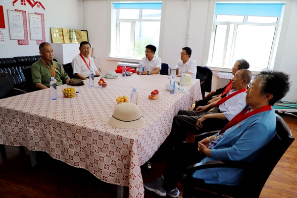 阿木爾林業(yè)局黨委副書記、局長韓鳳泉(中)“七一”走訪慰問退休老干部尹遜言(王力 攝)