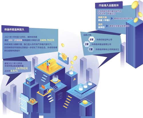 一系列開放舉措吸引了外資的高度關注和認可,外資參與中國市場熱情高漲,在華投資展業(yè)活動加快推進。截至2021年10月末,外資持有A股流通市值3.67萬億元,占比約4.97%。