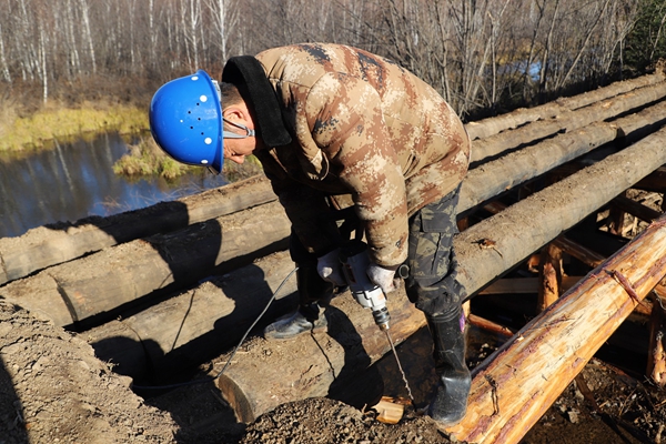 阿木爾林業(yè)局多種經營公司職工李訓武在修復水毀橋梁(王力 攝)
