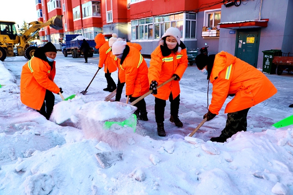阿木爾林業(yè)局環(huán)衛(wèi)隊(duì)職工清理居民樓前硬化地面積雪,喜迎新春佳節(jié)(王力 攝)