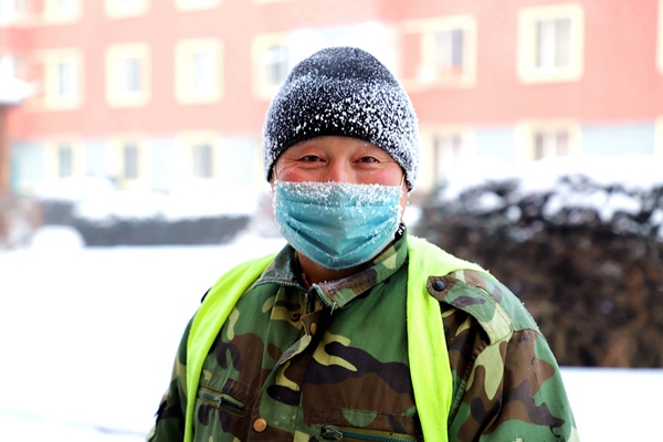 阿木爾林業(yè)局環(huán)衛(wèi)隊(duì)職工單廣躍冒嚴(yán)寒清理生活垃圾,口罩、帽子上結(jié)滿冰霜(王力 攝)