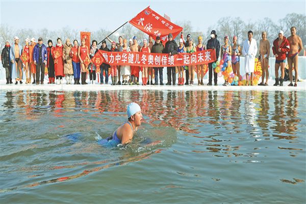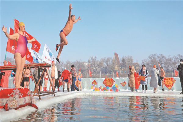 2月1日,正月初一。哈爾濱市冬泳協(xié)會(huì)的幾十位隊(duì)員,在會(huì)長(zhǎng)張友慶的帶領(lǐng)下,以冬泳的方式,迎接壬寅虎年的到來(lái)。松花江上的冬泳場(chǎng),披紅掛彩,貼上了福字。隊(duì)員們輪番從高臺(tái)、低臺(tái)上躍身而下,在江水中暢游。張友慶表示,大年初一,哈爾濱冬泳人響應(yīng)全民健身的號(hào)召,以冬泳的方式,積極參與到冰雪運(yùn)動(dòng)中來(lái),以健康的身體、飽滿(mǎn)的精神,迎接北京冬奧會(huì)。