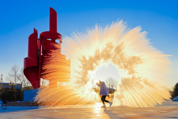 游客在大興安嶺體驗潑水成冰