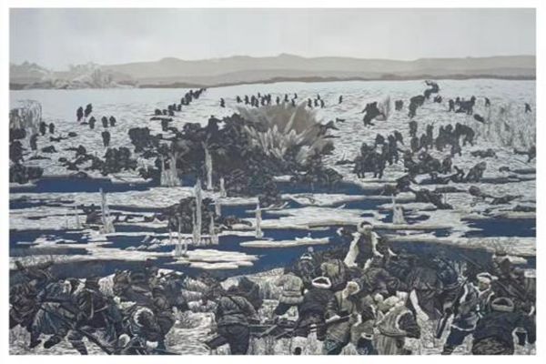 版畫作品《冰趟子戰(zhàn)役中的趙尚志》實景再現(xiàn)了東北抗日聯(lián)軍殲敵最多的著名戰(zhàn)役一一冰趟子戰(zhàn)役,展現(xiàn)了趙尚志同志指揮若定、英勇殲敵的英雄形象??孤?lián)戰(zhàn)士借助冰趟子封凍這一東北地區(qū)特有的有利地形,化被動為主動,對尾追日軍進行伏擊,殲滅大量日軍。體現(xiàn)了東北抗聯(lián)在極其惡劣的條件下,捍衛(wèi)中華民族的無畏斗爭精神。