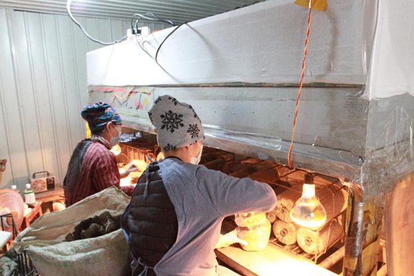 圖強林業(yè)局靈芝種植園內(nèi),技術人員在進行靈芝菌包注菌(趙明 攝)