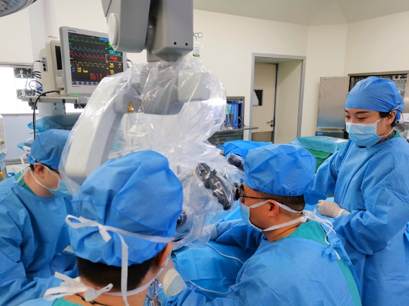 檢查結果出來后,孫國章主任醫(yī)師建議王女士行右側顳葉占位切除并行病理檢查。與家屬詳細交代手術的必要性及相關風險,患者家屬表示知情同意行手術治療。術前準備完畢后,孫國章主任醫(yī)師為王女士在全麻下進行了右側顳葉占位切除+血腫清除術,術中孫國章主任醫(yī)師在顯微鏡下仔細分離腫瘤組織與腦組織邊界,將腫瘤組織全切并將血腫全部清除,手術過程順利。王女士術后恢復良好,頭部CT復查顯示腫瘤完全切除,血腫清除徹底,病理回報為腦膠質母細胞瘤,現(xiàn)已出院準備進行放化療等下一步綜合治療。