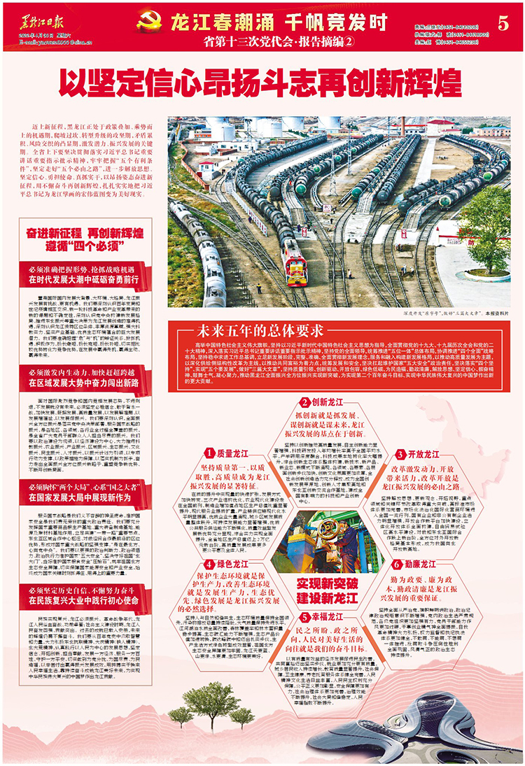 邁上新征程,黑龍江正處于政策疊加、乘勢(shì)而上的機(jī)遇期,爬坡過(guò)坎、轉(zhuǎn)型升級(jí)的攻堅(jiān)期,矛盾累積、風(fēng)險(xiǎn)交織的凸顯期,激發(fā)潛力、振興發(fā)展的關(guān)鍵期。全省上下要堅(jiān)決貫徹落實(shí)習(xí)近平總書(shū)記重要講話(huà)重要指示批示精神,牢牢把握“五個(gè)有利條件”,堅(jiān)定走好“五個(gè)必由之路”,進(jìn)一步解放思想、堅(jiān)定信心、勇?lián)姑⒄孀?shí)干,以昂揚(yáng)姿態(tài)奮進(jìn)新征程,用不懈奮斗再創(chuàng)新輝煌,扎扎實(shí)實(shí)地把習(xí)近平總書(shū)記為龍江擘畫(huà)的宏偉藍(lán)圖變?yōu)槊篮矛F(xiàn)實(shí)。
