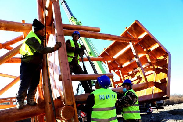阿木爾林業(yè)局建設者安裝薩布素景點大門(王力 攝)