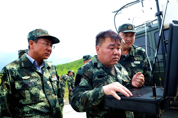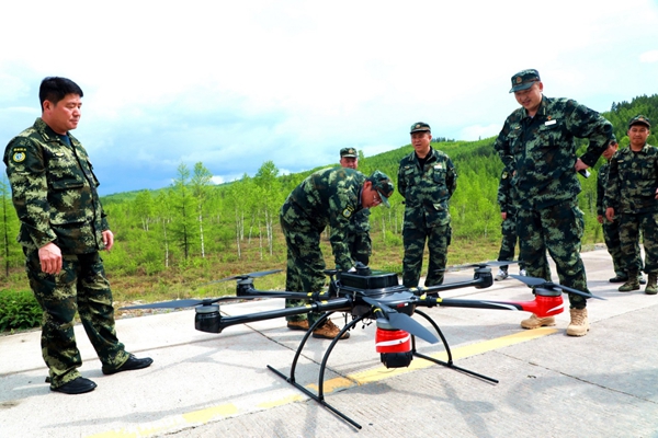 阿木爾林業(yè)局黨委副書記、局長(zhǎng)、局防指總指揮韓鳳泉(左二)在查看無人機(jī)狀況(王力 攝)