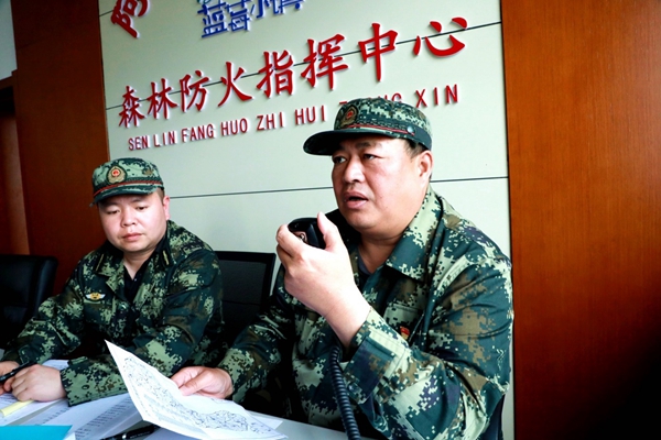 阿木爾林業(yè)局黨委書記、局防指總政委胡守慶(右)得知火情后迅速趕到局防指,坐鎮(zhèn)指揮(王力 攝)