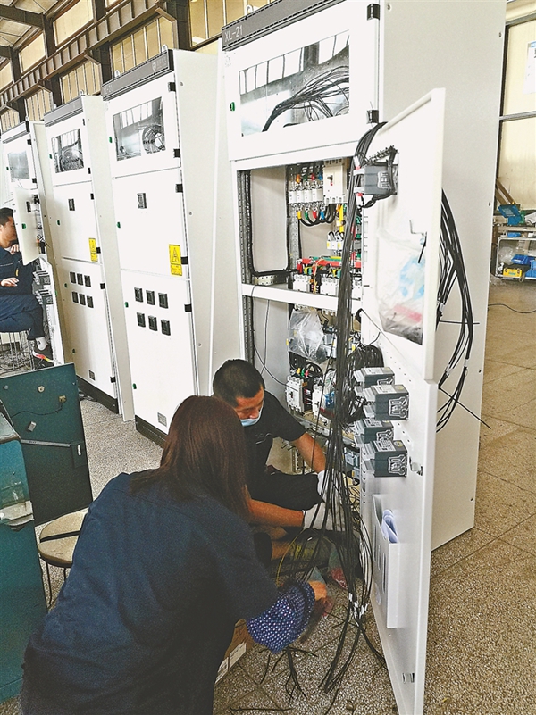在生產(chǎn)車間,記者看到,工作人員正熟練地組裝配電設(shè)備。該公司擁有現(xiàn)代化廠房2.2萬平方米,實(shí)現(xiàn)了工業(yè)化和信息化高度融合。