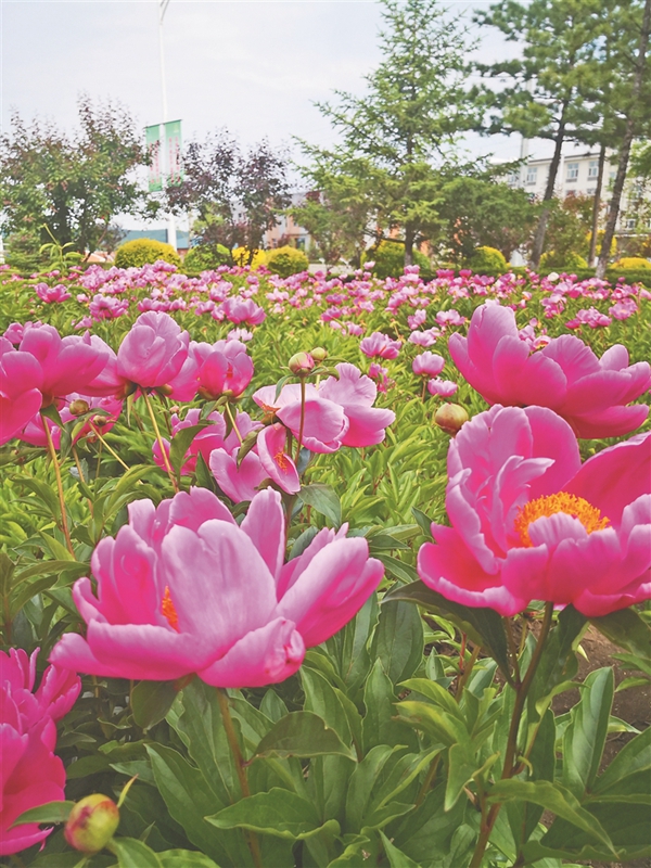 沿著公路,中藥材種植基地呈現(xiàn)一片花海:大片芍藥已經(jīng)開(kāi)花,白的粉的隨風(fēng)飄搖;千畝黃芩都已經(jīng)3歲,仿佛綠蘿緞一直蔓延到遠(yuǎn)方的山坡;萬(wàn)畝沙棘谷,更像一幅水墨畫,剛露頭的沙棘果盡顯萌態(tài);樹下間作的蒲公英盛開(kāi)著黃色的小花;紫的泛黑的藍(lán)靛果吸引一群群鳥兒不停來(lái)啄食……
